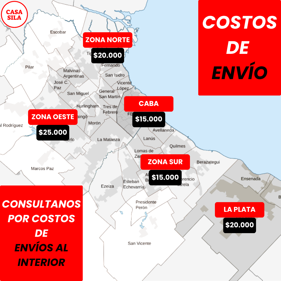 Realizamos envíos a todo el país a través de las empresas MDCargas, Via Cargo, Crucero del Norte y Cruz del Sur. El tiempo de demora de entrega una vez despachado el producto por alguno de estos medios generalmente es de 7 a 10 días hábiles. Para los envíos al Gran Buenos Aires, compartimos este mapa con los costos por zonas: